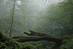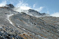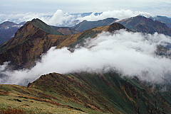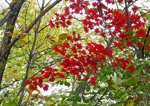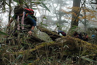 今年の悪天候のせいで登山道の復旧が間に合わず秩父槍ヶ岳を中止した代替えの山。なかなか行く気になれない、ヤブ山「両詰山」にしました。変更を快く了承して頂いた7名の皆さんありがとう。 両詰山は、両神から東に派生する天理尾根の東端の790mの里山。日向大谷の登山口から両神山と反対に右の淋しい山道がスタート。 期待は薄かったけど、登ってみると丁度紅葉の真っ盛り!曇天ながら両神山や二子山がよく見えてます。しっかりした山道が2ピッチ目から怪しくなり、跡が消えたり、逆に幾筋もの作業道と交錯したりで解らなくなります。時には狭いリッジを通過して「逆の期待はずれでなかなか面白いね」などと言っているうち、思いの外あっさりと両詰山に着きました。 これから先も行きたい方には踏跡なんか有りません。地図で確認した方向に伸びる尾根を探して、道じゃない斜面を急降下。少し下って尾根をキープすると踏み跡も出てきました。その後も現れたり消えたりの道を下山口の加明地へ降りました。 途中聞かれた質問にお答え Q.何故、あまり迷わないの? A.経験も必要ですが、基本的には尾根筋を忠実に進むこと。地図を度々眺めて実際の地形と見比べること。目標地点の方位角度を調べ、コンパスでずれないように確認しながら歩くことなどでしょう。 午後から雨にも降られましたが、楽しんで頂けたようで拾い物の山でした。 日向大谷発10:10 両詰山12:10 加明地14:20 写真;思いがけなく美しかった紅葉